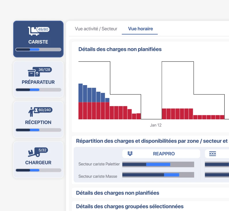 La solution de Planification Prévisionnelle des Ressources est un outil qui permet, en temps-réel et grâce à un moteur de prévision, d’optimiser le dimensionnement des ressources, qu’elles soient permanentes ou temporaires. Grâce à cette solution, le responsable entrepôt est en mesure de planifier le bon niveau de ressources pour produire la charge future sur les différentes activités de l’entrepôt. Il peut alors réduire les effectifs en période creuse ou au contraire prévoir des collaborateurs additionnels pour maintenir le niveau de service en cas de pic d’activité.